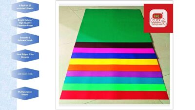 Brighten and elevate your creative work with this premium FIRST CLICK Multi-Color Chart Paper Set. The pack includes 20 high-quality sheets, featuring 4 vibrant pieces each in Pink, Mint Green, White, Yellow, and Sky Blue—perfect for a wide variety of artistic and academic applications. Each sheet measures 70 × 55 cm and is crafted with a sturdy 200 GSM thickness, providing durability and a smooth, plain surface ideal for drawing, painting, poster making, chart preparation, collage work, and DIY crafts. The rich pastel colors add visual appeal, making projects stand out beautifully in classrooms, exhibitions, and presentations. Easy to cut, fold, and decorate, these multi-color sheets are an essential addition for students, teachers, artists, and hobby crafters seeking reliable and premium-quality chart paper.