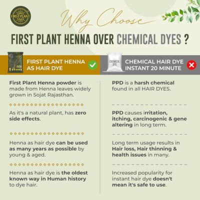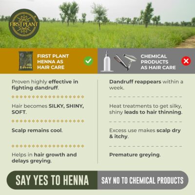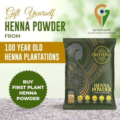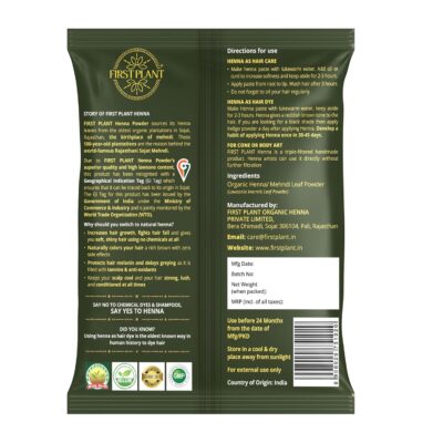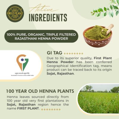 FIRST PLANT Premium Rajasthani Henna Powder is made from 100% organic, GI-tagged henna sourced directly from farms. It provides natural hair color while supporting healthy hair and scalp care.