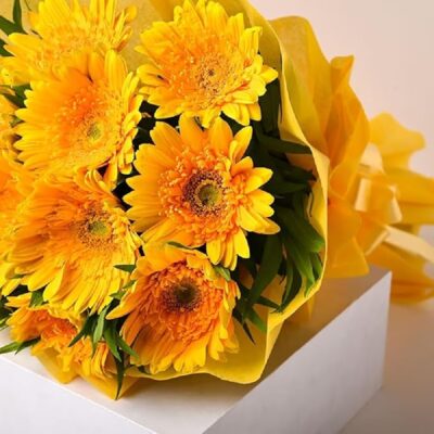 Flower Aura Fresh Live Flower Bouquet of 10 Yellow Gerberas is a bright and cheerful floral gift that perfectly expresses happiness, warmth, and positivity. This elegant bouquet features 10 fresh, handpicked yellow gerbera flowers known for their vibrant color and long-lasting freshness. Yellow gerberas symbolize joy, friendship, and optimism, making this bouquet an ideal choice for birthdays, anniversaries, weddings, Mother’s Day, Father’s Day, and love & romance gifting. Beautifully arranged and wrapped with care, it adds instant freshness and charm to any celebration. With the convenience of same-day delivery, this bouquet is a wonderful way to surprise your loved ones and make their special moments even more memorable.