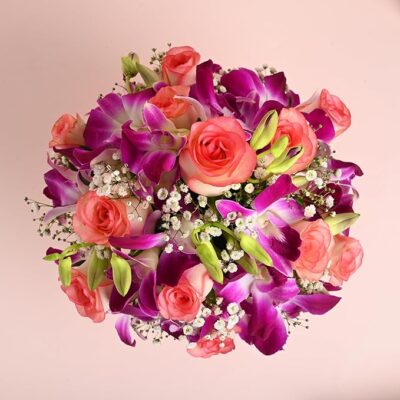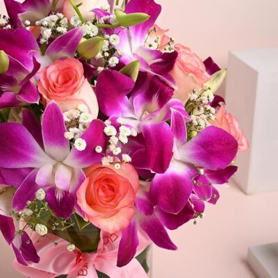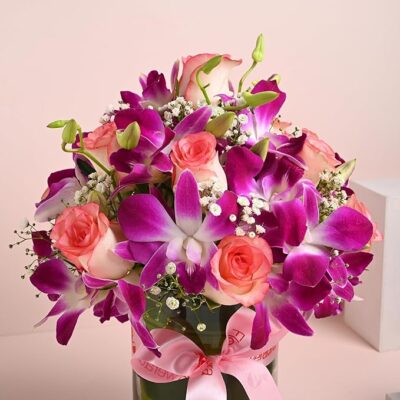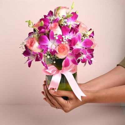 This beautiful bouquet combines the soft charm of fresh pink roses with the rich, royal elegance of purple flowers, artistically arranged in a classy glass vase.