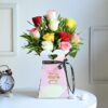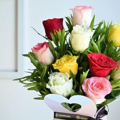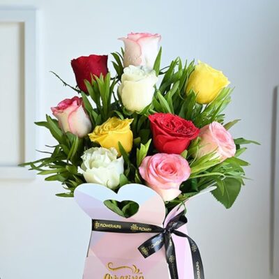 This premium arrangement features 10 fresh, silky-textured roses in beautiful mixed colors, artistically placed in a stylish gift box that adds a modern and luxurious touch.