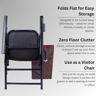 The integrated adjustable writing pad/desk let makes it ideal for home study, coaching classes, tuition rooms, or compact office spaces, while its folding design enables easy storage when not in use.