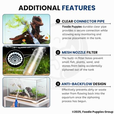 The gravel cleaner and siphon vacuum make water changing and sand cleaning simple and safe. Equipped with a soft flexible hose, it reaches every corner of the tank without difficulty. The built-in filter ensures small fish and shrimps are not sucked up during cleaning, making it safe for all aquariums.
