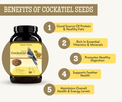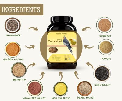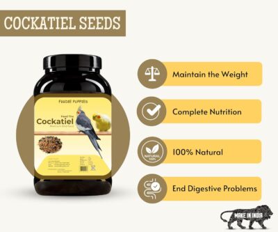 Give your cockatiels the best nutrition with Foodie Puppies Premium Bird Food, a thoughtfully formulated mix of natural seeds including foxtail millet, striped sunflower, kusum/safflower, buckwheat, red sorghum, oats, yellow proso, imported canary seed, and more.
