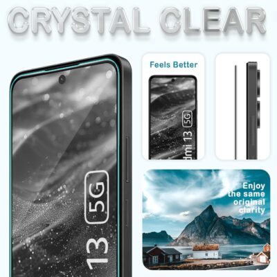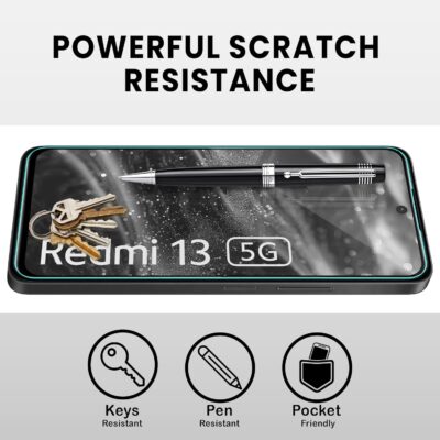 The Tempered Glass Screen Protector provides reliable full-edge protection for Redmi 13 5G, Poco M6 Pro 5G, and Redmi 12 5G/4G smartphones. Engineered with 9H hardness, it safeguards your display from scratches, impacts, and accidental drops while preserving responsive touch sensitivity. Its full-coverage design ensures every corner of the screen is protected without affecting case compatibility. The ultra-clear HD transparency maintains vivid colors, sharp details, and original display brightness for an excellent viewing experience. Installation is hassle-free with the included kit, allowing bubble-free and precise alignment. An oleophobic coating helps resist fingerprints, smudges, and oil stains to keep your screen clean. Strong, clear, and convenient, this protector delivers long-lasting safety for your Redmi and Poco devices.