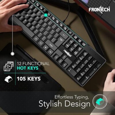 FRONTECH Multimedia USB Wired Keyboard, 105 Keys, 12 Hot Keys, Ergonomic Design with Adjustable Clips, Soft & Laser Printed Keys, Plug and Play (KB-1671)