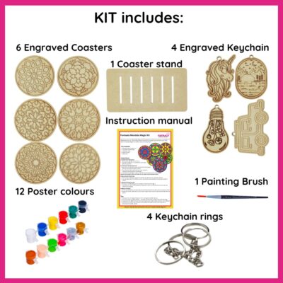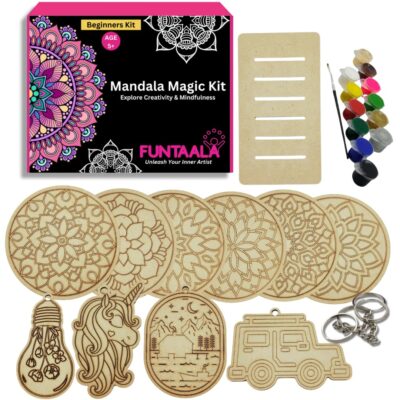 Explore creativity and mindfulness with the Funtaala Wooden Mandala Paint Kit — a DIY Coaster Painting Set designed for kids aged 9 to 15 years. This engaging art and craft kit includes premium wooden tea coasters, vibrant paints, and a brush, allowing children to create their own beautiful mandala designs. Perfect for enhancing focus, creativity, and patience, this fun-filled kit helps kids learn the traditional art of mandala painting while making stylish hand-painted coasters. An excellent gift for girls and boys, it’s ideal for birthdays, school projects, or family art time.
