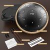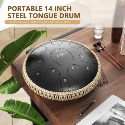 The FYA 14 Inch Steel Tongue Drum (15 Notes, D Major, Black) is a beautifully engineered handpan-style percussion instrument crafted from high-quality alloy steel and precision-cut to deliver a full, rich tonal range in the key of D major. With its 15 tuned tongues, this drum enables a wide variety of melodies and harmonies—ideal for both beginners and seasoned players alike. The large 14-inch diameter gives it deeper resonance and longer sustain relative to smaller models. It arrives complete with accessories: rubber mallets, finger picks, spare note stickers, a padded travel bag, and a music book—making it ready to play out of the box. Its elegant black finish, coupled with professional sound quality, makes it perfect for meditation, yoga, music education, sound healing, or intimate performances, while its sturdy build ensures durability and portability.