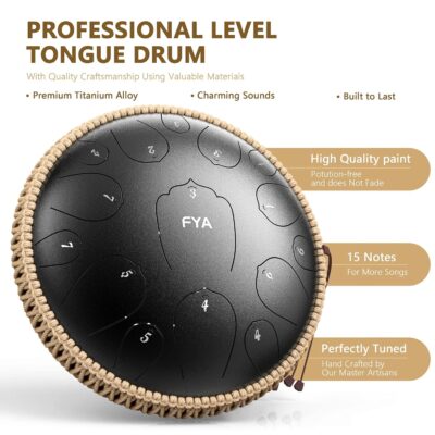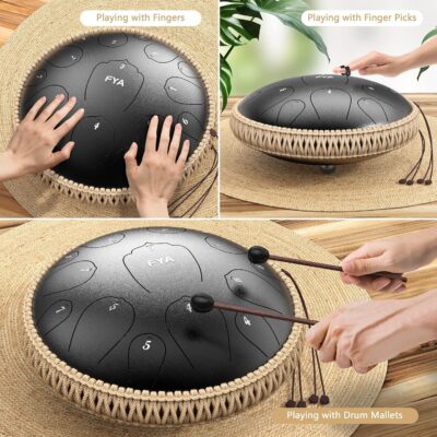 FYA 14 Inch Steel Tongue Drum 15 Notes D Major for Kids and Adults with Rubber Mallets, Finger Picks and Padded Travel Bag, Unique Gifts for Him or Her (Black-15 Note 14 Inch)