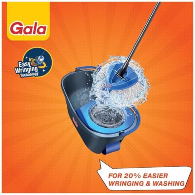 The Gala Turbo Spin Mop is a powerful and hygienic floor-cleaning system designed to deliver deep cleaning while removing over 99% of bacteria. It features a unique triangular mop head that easily reaches corners, edges, and hard-to-clean areas for thorough coverage. The built-in spin wringer helps remove excess water efficiently, ensuring better moisture control and faster floor drying. Equipped with an easy-move big wheel, the sturdy bucket can be rolled smoothly without lifting, reducing effort during cleaning. This mopping set includes 2 high-absorbency microfiber refills that effectively trap dust, dirt, hair, and spills while being gentle on surfaces like tiles, marble, granite, and other smooth floors. Finished in a stylish grey and blue color combination, the 4-piece Gala Turbo Spin Mop Set is ideal for homes and offices, offering comfort, durability, and superior cleaning performance for everyday floor care.