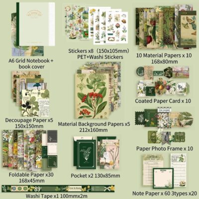 This vintage-themed kit includes high-quality scrapbook papers, aesthetic stickers, and collage materials, allowing users to design personalized journals, photo albums, and decorative scrapbooks.
