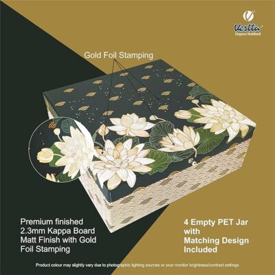 Be the first to review “Gift Box | 9 (L) X 9 (B) x 3.5 (H) Inch, Lotus Floral, Gold Foiling, Designer box with 4 Empty Jars for Diwali, Weddings, Christmas, Corporate Gift Hampers”
