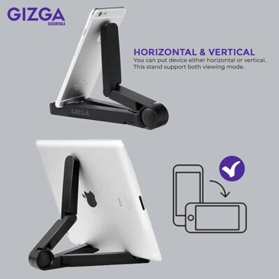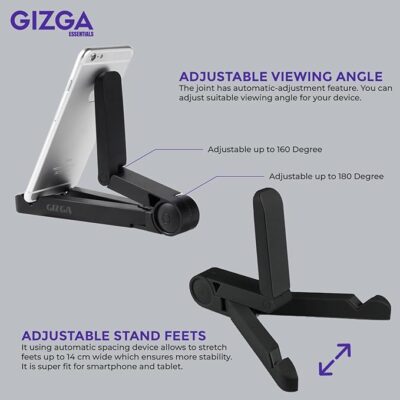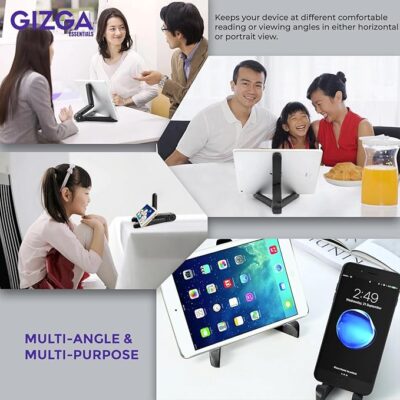 GIZGA ESSENTIALS Portable Tabletop Tablet Stand Mobile Holder, Desktop Stand, Cradle, Dock for iPad, Smartphone, Kindle, E-Reader, Fully Foldable, Adjustable Angle, Anti-Slip Pads, Black
