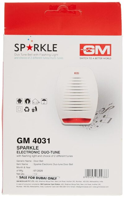 GM Sparkle Electronic Duo Tune Door Bell is a stylish electronic doorbell designed to deliver clear dual-tone alerts for homes. Its compact design and reliable performance make it suitable for everyday residential use.