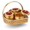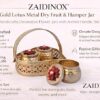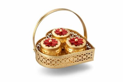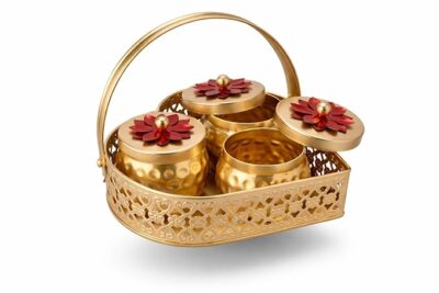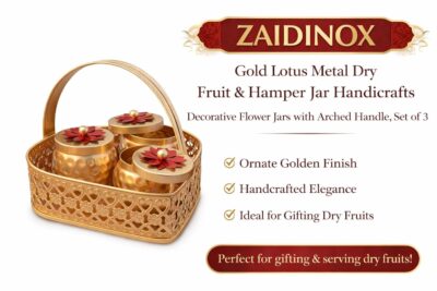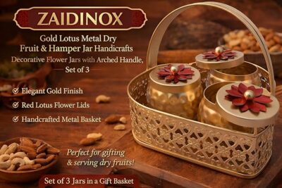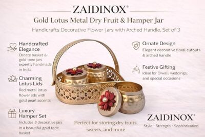 Be the first to review “Gold Lotus Metal Dry Fruit Hamper Jar Set of 3 with Basket | Decorative Handcrafted Storage Jars with Arched Handle for Diwali Wedding Gifting Home Decor Premium Festive Tabletop Organizers!”