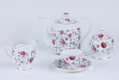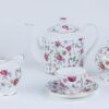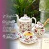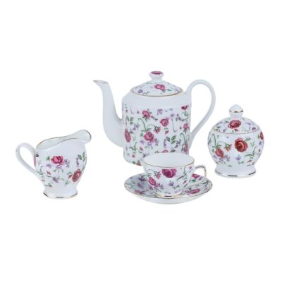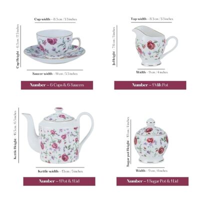 This premium set includes 6 teacups, 6 matching saucers, 1 tea kettle, 1 milk pot, and 1 sugar pot, offering a complete and refined serving solution.