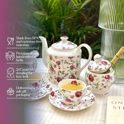 GOLDEN QUEEN’S Teacup Set with Kettle, Sugar & Milk Pot (15 Pieces – Button Rose) is a luxurious and elegant serving collection crafted to elevate your hosting and tea-time gatherings. This premium set includes 6 teacups, 6 matching saucers, 1 tea kettle, 1 milk pot, and 1 sugar pot, offering a complete and refined serving solution. Adorned with exquisite 24K gold detailing and a delicate Button Rose design, the set brings a regal charm and timeless sophistication to your table. Ideal for serving tea, coffee, and beverages during special occasions, celebrations, or formal get-togethers, it blends graceful aesthetics with functional design. Perfect for hosting, festive use, and gifting, the GOLDEN QUEEN’S tea set makes every tea moment feel truly special.