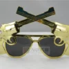 Golden Revolver Party Shades! Designed with shiny golden frames and topped with a dramatic crossed-pistols motif, these glasses are a show-stopping accessory for wild west-themed parties, costume events.