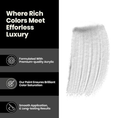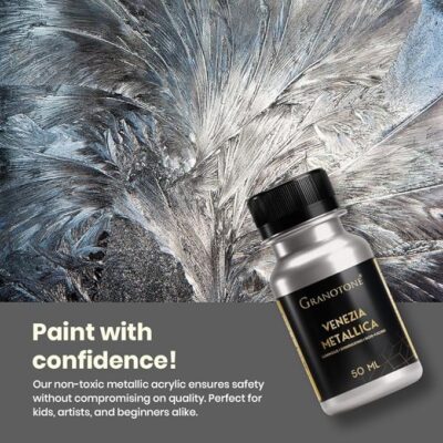 GRANOTONE Acrylic Venezia Metallic Colour (50 ml – Silver) offers a stunning shimmering finish, crafted with rich metallic pigments for brilliant shine and smooth coverage. Its non-fading, non-toxic, and quick-drying formula makes it safe and perfect for kids, beginners, hobbyists, and professional artists alike. This versatile metallic acrylic adheres beautifully to canvas, wood, paper, metal, plastic, clay, fabric, and DIY décor surfaces, delivering a long-lasting, elegant silver sheen. Ideal for artwork highlights, festive crafts, home décor projects, and mixed-media creations, this premium 50 ml silver paint ensures vibrant metallic effects and reliable performance every time.