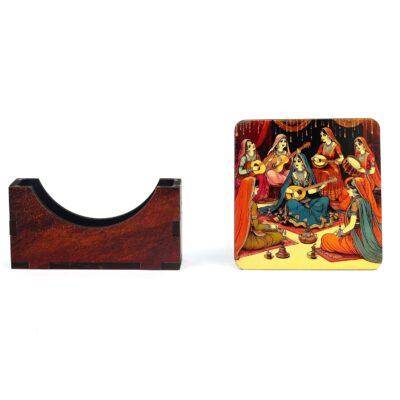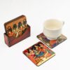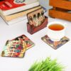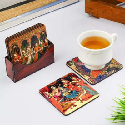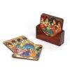 Handmade Wooden Coasters Set with Holder – Ethnic Rajasthani Art Print | Heat Resistant Tea Coffee Cup Coasters | Decorative Tableware Gift (Set of 6)
