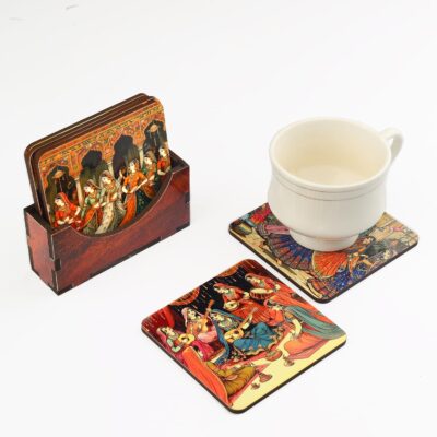 The Handmade Wooden Coasters Set with Holder is designed to combine functionality and traditional artistry. Each coaster is crafted from durable wood and features intricate Rajasthani art prints, making them both practical and visually appealing. The coasters are heat-resistant, ideal for protecting tables from hot tea, coffee, or beverage cups. The included wooden holder keeps the set organized and easy to store when not in use. Perfect for daily use at home, office, or during gatherings, they add a rustic and artistic charm to any space. Lightweight yet sturdy, the coasters are easy to clean and maintain. This set also makes a thoughtful and elegant gift for housewarmings, festivals, or special occasions.