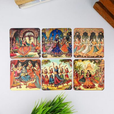This Handmade Wooden Coasters Set features six coasters with ethnic Rajasthani art prints and a matching holder. Heat-resistant and stylish, it protects tables while adding a decorative touch to any home or office.