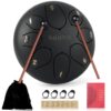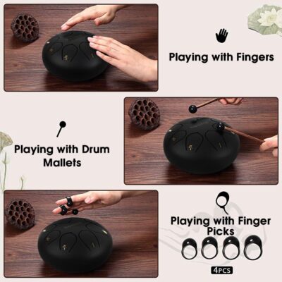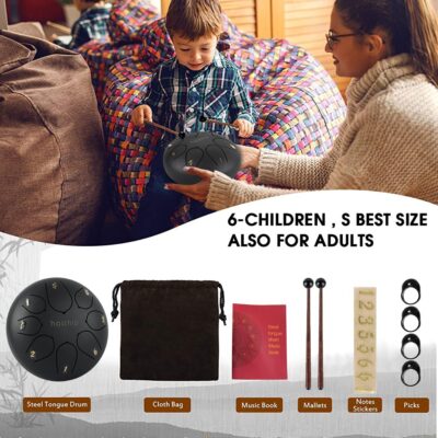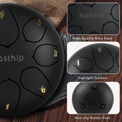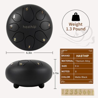 The HASTHIP® Steel Tongue Drum 8-Note (6-inch, Black) is a sleek and melodious percussion instrument designed for everyone from curious children to adult meditators. Crafted of high-quality titanium alloy steel with a smooth matte black finish, it features eight precision-cut tongues (in a lotus or petal motif) that resonate with warm, soft, and ethereal tones whether tapped with the included mallets or played by hand. Its compact 6-inch size delivers surprising sustain and clarity in intimate settings. The package comes complete with a padded carrying bag for safe transport, two wooden mallets, finger picks, spare note stickers, and a beginner’s music book—making it ideal for music education, meditation, yoga, sound therapy, casual concerts, or simply relaxing at home. Elegant, durable, and versatile, this black tongue drum unites artistry, music, and mindfulness in one instrument.