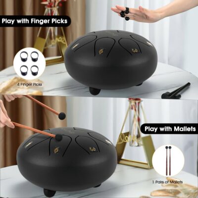 HASTHIP® Steel Tongue Drum 8 Note, 6 inch Percussion Instrument Handpan Drum with Bag, Music Book and Mallets for Kids and Adults Meditation Musical Education Concert Mind Healing Yoga (Black)