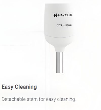 Powerful 300W Havells hand blender with low noise, copper motor, detachable stem, and sharp blades for efficient blending.