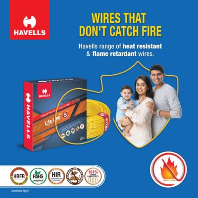 Havells LifeLine+ S3 6 sq.mm copper wire ensures reliable performance with its 100% copper Class 2 conductor. Designed with heat-resistant and flame-retardant PVC insulation, it offers enhanced safety for both domestic and industrial applications. Ideal for internal wiring and powering electrical devices like fans, lights, and appliances with efficiency.