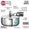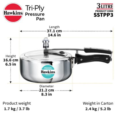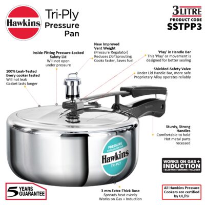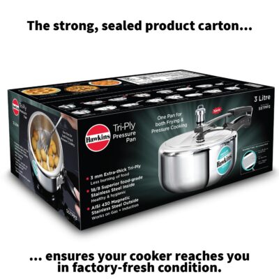 The Hawkins 3 Litre Tri-Ply Pressure Cooker cum Pan is a versatile kitchen essential with a wide, easy-stir design. Crafted with 3 mm thick tri-ply stainless steel, it ensures even heating and minimal burning. Suitable for gas and induction cooktops, it’s perfect for sautéing and pressure cooking in one.