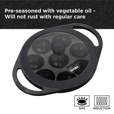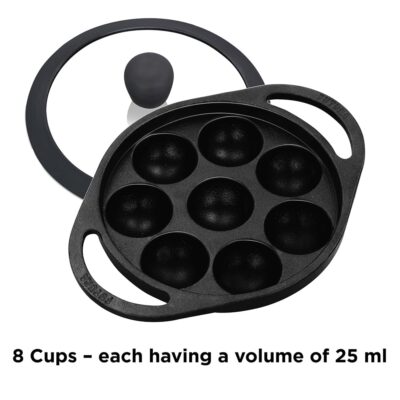 Naturally nonstick cast iron appe pan with 8 cups, glass lid, ergonomic handle – ideal for crispy, tasty Indian snacks.