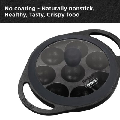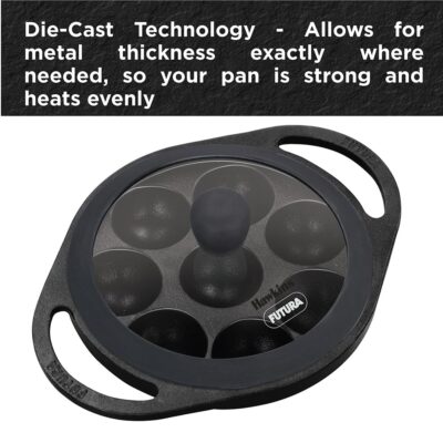 Hawkins Futura 16 cm Cast Iron Appe Pan, Non Stick Paniyaram Pan with Glass Lid, 8 Cups Paniyarakkal Pan, Litti Pan, Kuzhi Paniyaram Pan, Ponganalu Pan, Black (CIAP16G)