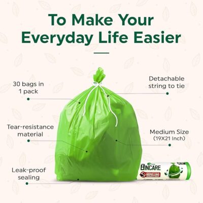 HI Care BINCARE India’s 1st Pest Repellent Compostable Garbage Bags – Medium Size (19 × 21 Inches, Pack of 120) are specially designed for hygienic, eco-friendly, and pest-controlled waste disposal. Made from compostable and biodegradable material, these garbage bags help reduce plastic waste while remaining strong, leak-resistant, and reliable for both wet and dry waste. Infused with a refreshing mint scent, they help repel pests and deny food access to cockroaches, keeping your kitchen and surroundings cleaner and safer. The convenient string-tie closure ensures easy tying, lifting, and mess-free disposal. This value pack includes 4 packs of 30 bags each (total 120 bags), making it ideal for homes, kitchens, offices, and commercial spaces where cleanliness, sustainability, and pest prevention are a priority.