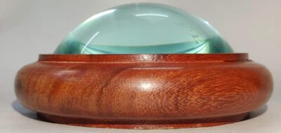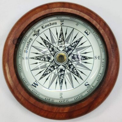 Half-moon nautical compass paperweight with a solid glass lens and wooden finish — a stylish desk accessory and unique gift.