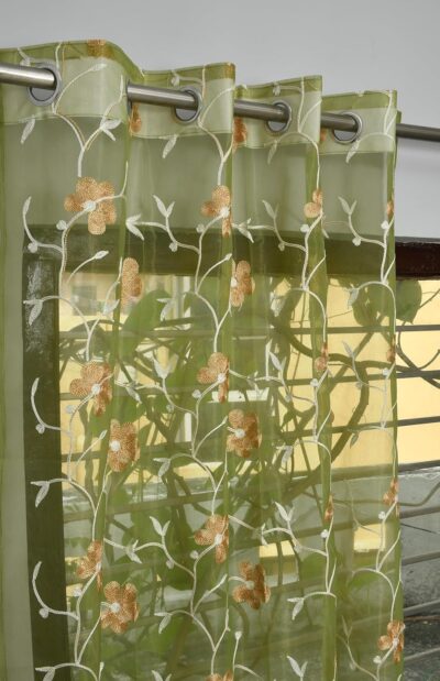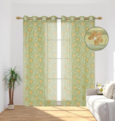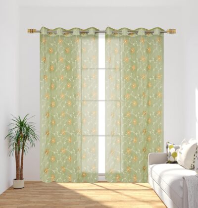 This charming two-panel door-length curtain set from Homefab India is sized at approximately 7 feet (≈ 213 cm) in drop × 4 feet (≈ 122 cm) in width per panel, making it a great fit for standard tall doors or full height windows. Crafted from transparent sheer net fabric, it features delicate floral embroidery in a soothing green colour scheme (for the variant listed) — offering a decorative, airy look that softly filters light while maintaining an open, attractively styled ambience. The top is finished with metal eyelets that enable smooth rod movement and straightforward hanging. Because the fabric is lightweight sheer, it allows daylight to gently brighten your space rather than block it out, making it ideal for living rooms, bedrooms or spaces where you want style plus ambient light, rather than heavy blackout coverage.