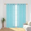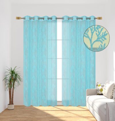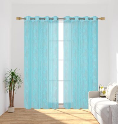 Upgrade your doorway or tall window with this stylish and decorative curtain set from Homefab India. Each set includes two panels, sized approximately 7 feet (≈ 213 cm) in height / drop × 4 feet (≈ 122 cm) width per panel—making it ideal for standard door openings or full-height windows. The fabric is described as a transparent net (tissue-net) material featuring a subtle floral print in an attractive aqua blue tone—giving the room a bright, airy feel while adding decorative elegance. The top is finished with metal eyelets/grommets (8 per panel as per listing) which allow for smooth sliding on a standard curtain rod, offering both ease of use and a neat, modern hang. The lightweight sheer construction allows daylight to filter through, creating a softly illuminated ambience while offering moderate visual privacy—a good choice if you want airy light rather than full blackout.