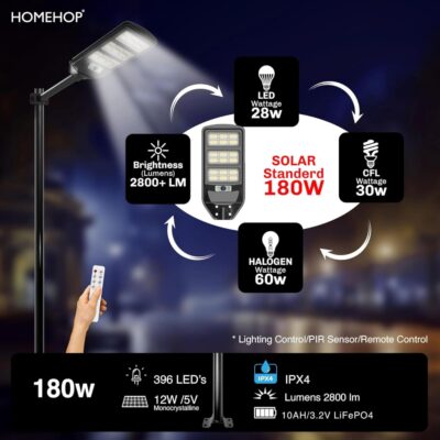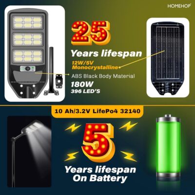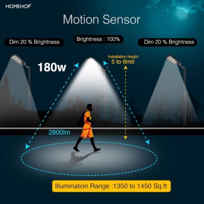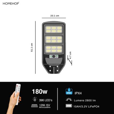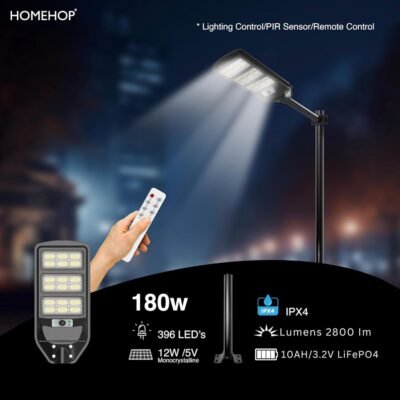 The Homehop Outdoor Solar Light 180W delivers powerful illumination with 396 LEDs for enhanced outdoor security and visibility. Designed with motion sensor technology and automatic operation, it is ideal for gardens, pathways, and home exteriors.