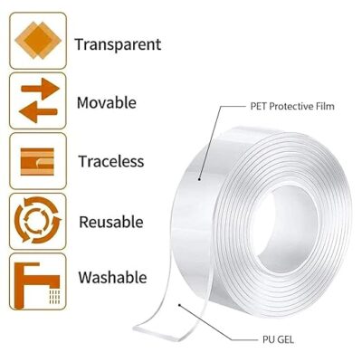 The HUBTURE 3 Meter Multipurpose Double-Sided Nano Grip Tape is a heavy-duty adhesive solution designed for strong, secure, and damage-free mounting. Made from high-quality silicone gel with a 2 mm thickness, this transparent tape provides excellent holding power with an anti-slip grip. It is heat resistant, washable, removable, and reusable, ensuring long-lasting performance without leaving residue or damaging surfaces. Ideal for home and office use, the tape securely mounts décor items, organizers, carpets, kitchen accessories, and tools on smooth surfaces such as walls, glass, tiles, metal, wood, and plastic. Easy to cut and apply, HUBTURE Nano Grip Tape offers a clean and convenient alternative to nails and screws.