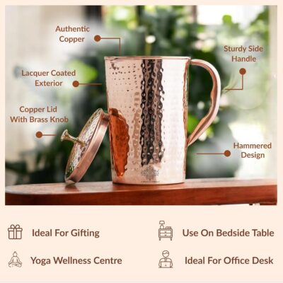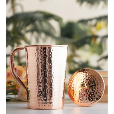 The Indian Art Villa Pure Copper Hammered Jug with Lid beautifully blends traditional Indian craftsmanship with modern elegance. Handcrafted from 100% pure copper, it features a distinct hammered texture that adds charm to your home, kitchen, or dining table.