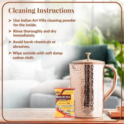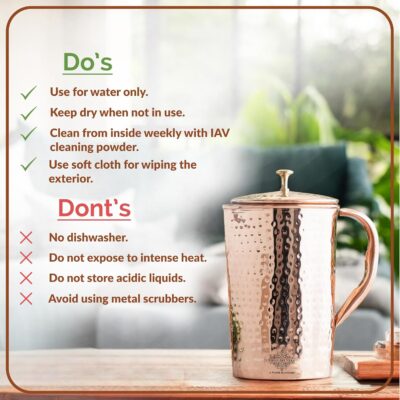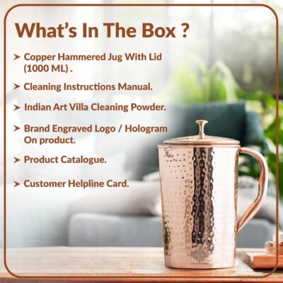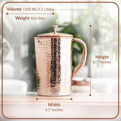 With a capacity of 1500 ml, this jug is ideal for storing and serving water, juices, or beverages at home, in offices, or during festive gatherings. Drinking from a copper vessel is known for its Ayurvedic health benefits, believed to aid digestion, improve immunity, and balance the body’s natural energies.