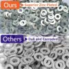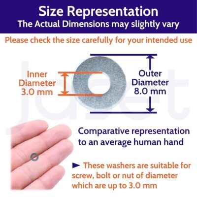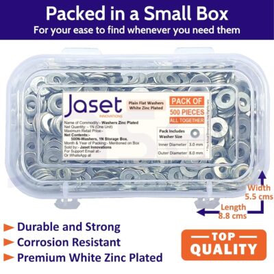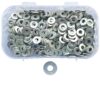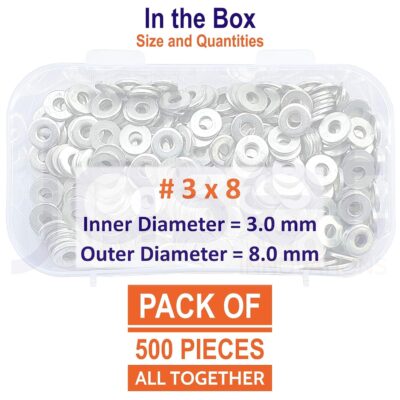 500-piece set of steel flat washers with white zinc plating, 3mm inner diameter and 8mm outer diameter. Durable, corrosion-resistant, and ideal for DIY and repair projects.