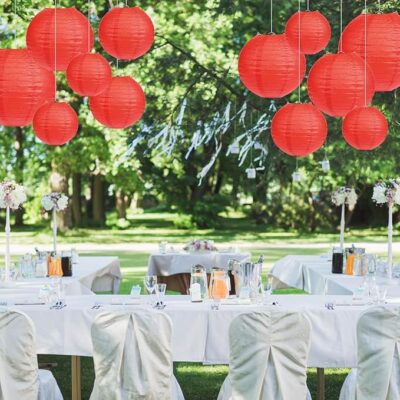 The Jamboree!!! Red Paper Lanterns come in a set of 2, each measuring 12 inches, offering a vibrant and festive decorative option for celebrations of all kinds. Crafted from high-quality, lightweight paper with a sturdy internal metal frame, these Chinese/Japanese-style lanterns hold their elegant round shape and are easy to assemble. The rich red color symbolizes joy, positivity, and good fortune, making them perfect for birthdays, weddings, Christmas, New Year parties, festivals, and cultural events. Each lantern includes hooks and string for effortless hanging, whether indoors or outdoors. Reusable with proper care, these lanterns instantly brighten up any space, creating a warm, charming, and visually striking atmosphere.
