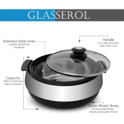 Serve and store food in style with the Jaypee Glasserol 1700 ml Casserole. Designed with a stainless-steel interior, durable PUF insulation, and a toughened glass lid, it keeps food hot and fresh for hours while adding elegance to your dining experience. Ideal for rotis, salads, rice, or even desserts.