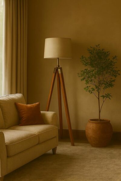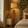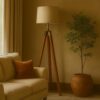 Elegant wooden tripod floor lamp with a beige jute shade, designed to add warm ambient lighting to your home or office. Durable build, stylish design, and backed by 1-year warranty. Perfect for living rooms, bedrooms, and study spaces.