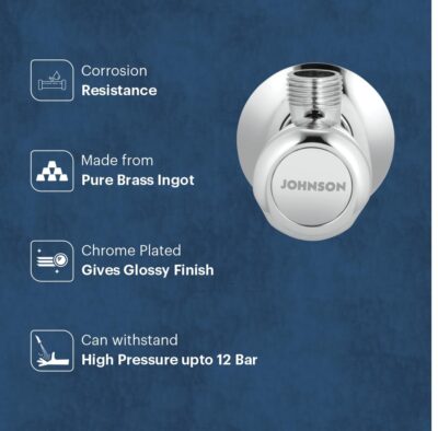 The Johnson Bathrooms Universal Brass Angle Cock with Flange is a premium-quality wall-mounted angle valve designed for reliable water flow control in bathrooms and kitchens. Made from high-grade brass, it offers excellent durability, corrosion resistance, and long-lasting performance. The chrome-plated exterior finish provides a sleek, polished look while protecting against rust and wear. Equipped with a wall flange, it ensures a secure and neat installation, making it ideal for faucets, geysers, or other water outlets. Supplied in a pack of 2, the Johnson Universal Brass Angle Cock combines functionality, style, and dependability, making it a trusted choice for both residential and commercial plumbing setups.
