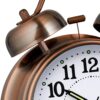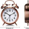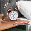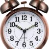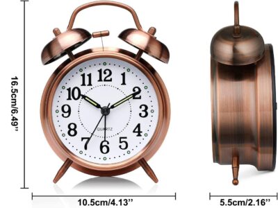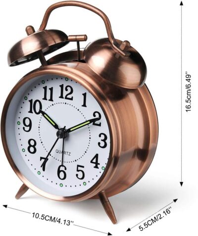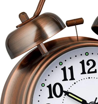 A 4-inch twin bell metal alarm clock in red-brown, designed for heavy sleepers. Battery-operated, silent, and equipped with a night light for bedrooms.