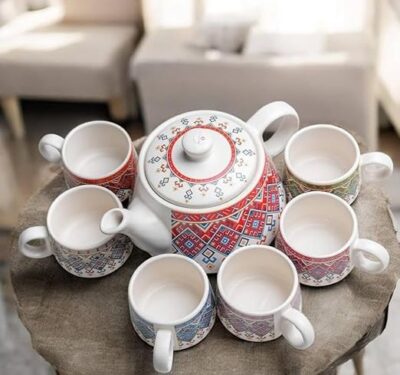 Be the first to review “Khurja Crockery hub Handcrafted Multicolor Geometric Print Ceramic Tea Set with Teapot & 6 Cups | Elegant Tableware for Home & Gifting”