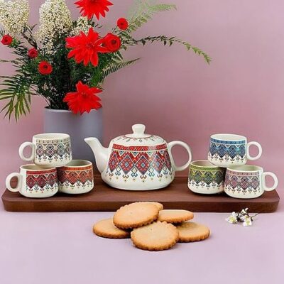 A handcrafted multicolor geometric ceramic tea set with teapot and 6 cups, perfect for serving and gifting.