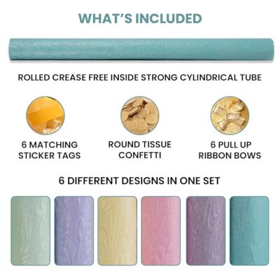 This pack of 6 high-quality sheets comes complete with gift tags, ribbon bows, and confetti, offering a full gift-wrapping experience in one set.